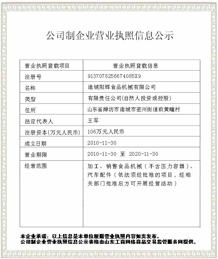 諸城陽(yáng)輝食品機(jī)械有限公司坐落于被譽(yù)為“中國(guó)龍城-舜帝故里”的山東省諸城市。是一家集研發(fā)、生產(chǎn)、銷售為一體的真空包裝機(jī)制造企業(yè),是中國(guó)食品機(jī)械行業(yè)的骨干企業(yè)。本公司于2004年注冊(cè),并于2010年再次注冊(cè),注冊(cè)資金已達(dá)到106萬(wàn)元人民幣。未來(lái),我公司將會(huì)再次注入資金,為企業(yè)的成長(zhǎng)增磚添瓦。