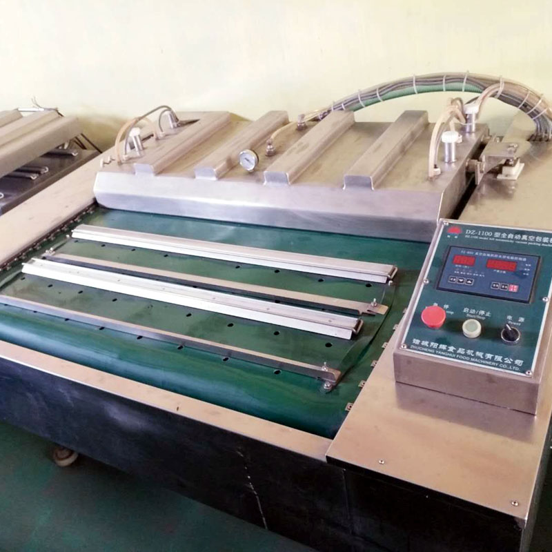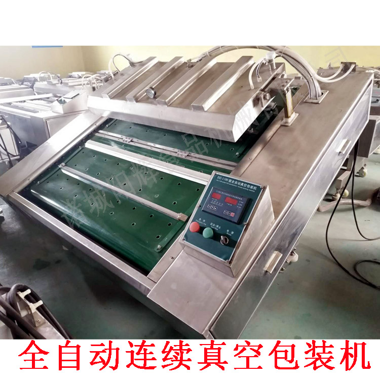 真空包裝是將包裝袋內抽成真空,然后熱封口,使包裝袋內行成真空,從而使被包裝的產品達到隔氧、保鮮、防潮、防霉、防銹、防蟲、防腐蝕、放污染等目的,有效地延長產品的保質期、保鮮期,便于存放和運輸。DZ-1100B全自動連續真空包裝機是全自動真空包裝機中的一種,是1000型的升級版。包裝速度更快,包裝產品更大,耗能低,擁有自動報警功能和一鍵冷卻清洗功能。操作簡單,設置好抽氣時間、加熱時間、放氣時間、冷卻時間后就可以開始工作了,期間無需按下真空蓋,無需收拾被包裝好的產品,只需要裝填真空袋就可以了。作為全自動連續真空包裝機,它可以連續自動完成上料、抽真空、熱封口、打印日期、冷卻、回氣、出料等工序,是客戶們非常喜歡的一種真空包裝機。